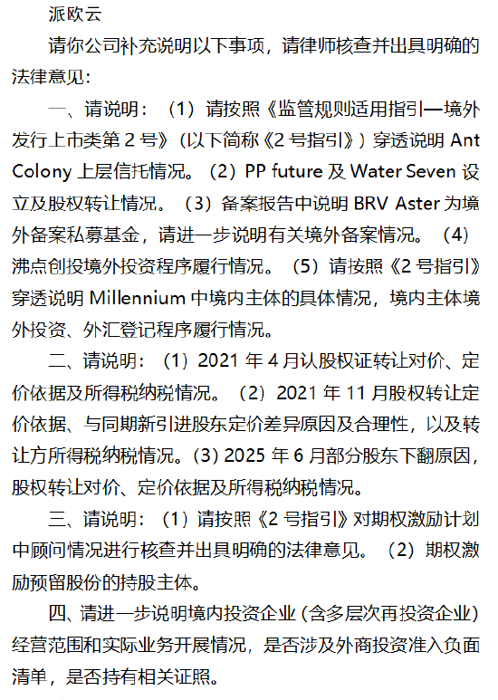 近日,派欧云收到中国证监会关于本次境外上市的备案反馈意见,证监会要求公司补充说明以下事项,并由律师核查出具明确法律意见,具体反馈如下: