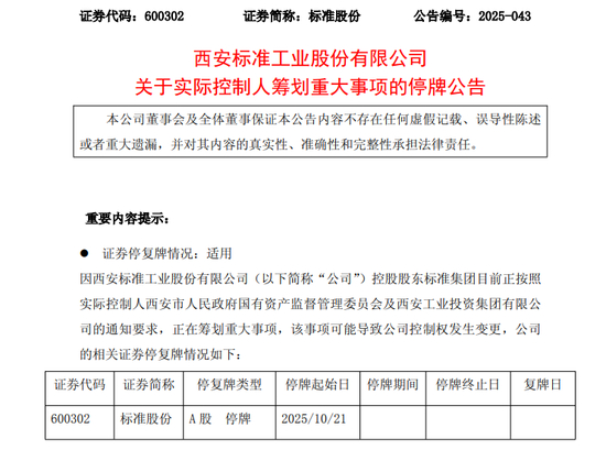 公告显示,标准股份在当日收到控股股东标准集团的通知,其目前正按照实际控制人西安市国资委及西安工业投资集团有限公司的通知要求筹划重大事项,该事项可能导致公司控制权发生变更。