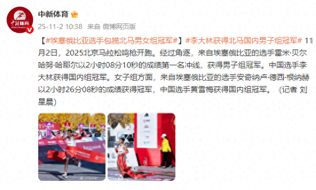 【埃塞俄比亚选手包揽北马男女组冠军】 11月2日,2025北京马拉松鸣枪开跑。经过角逐,来自埃塞俄比亚的选手雷米·贝尔哈努·哈耶尔以2小时08分10秒的成绩第一名冲线,获得男子组冠军。中国选手李大林获得国内组冠军。女子组方面,来自埃塞俄比亚的选手安奇纳卢·德西·根纳赫以2小时26分08秒的成绩获得冠军,中国选手黄雪梅获得国内组冠军。(记者 刘星晨)