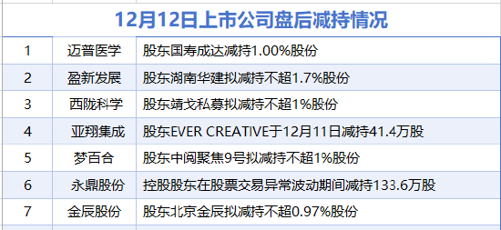 据统计,12月12日,盘后迈普医学、盈新发展、西陇科学、亚翔集成、梦百合、永鼎股份、金辰股份等7家A股上市公司披露减持情况。当日暂无上市公司披露增持情况。