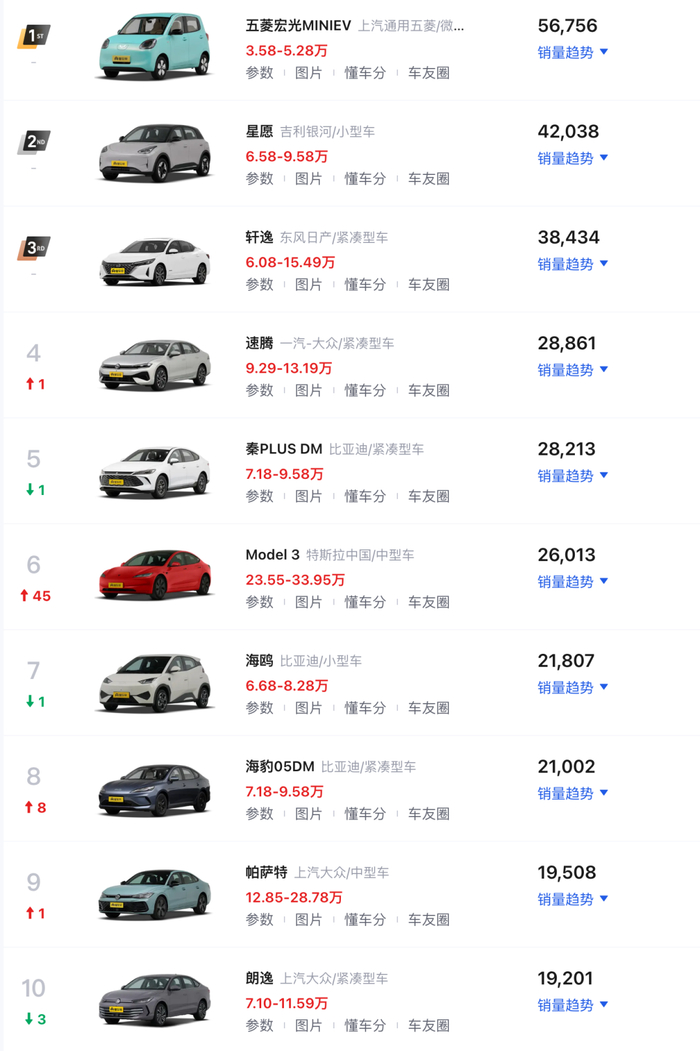 首先来看轿车销量榜,前十车型中有4款车型销量较10月排名提升,其中特斯拉Model 3排名大幅提升,较10月上升了43名,位列第六,当月销量为26013辆,为2025年以来单月最高销量表现。