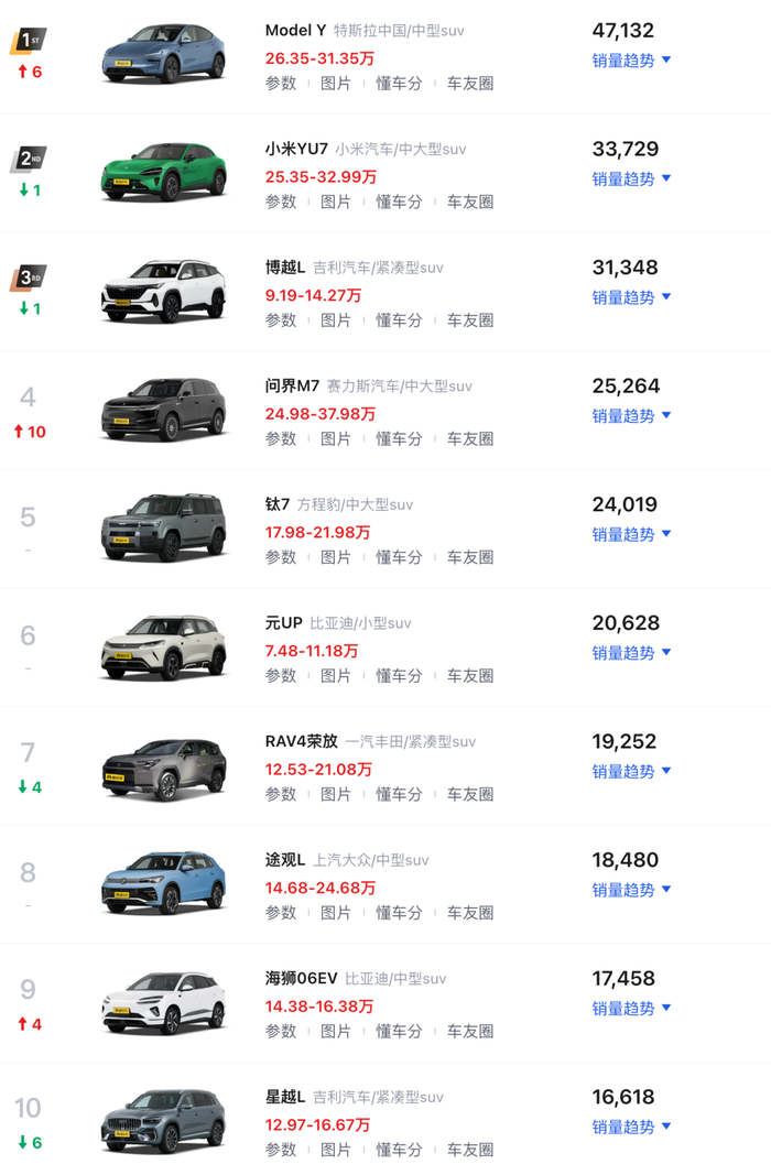 再来看看SUV榜单,增长较为明显的是特斯拉Model Y和问界M7,前者排名前进了7名,后者前进了10名,销量分别为47132辆、25264辆。11月销量榜第一名是特斯拉Model Y,重新超越小米YU7夺SUV榜第一位置,10月销量为19488辆。新款Model Y和Model Y L上市后,为消费者带来更全面的选择。