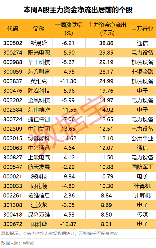 据数据宝统计,本周有64股主力资金净流出额在5亿元以上。新易盛净流出额居首,高达38.86亿元;阳光电源、华工科技、东方财富、英维克紧随其后,净流出额均在20亿元以上。
